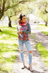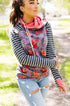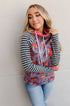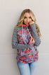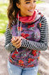 - Color: Purple base, coral floral with charcoal/white stripe sleeves and coral accents, charcoal and white striped sleeves with vintage washed purple floral body.