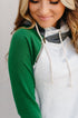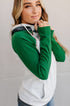 - Color: Oatmeal body, forest green sleeves, charcoal accents