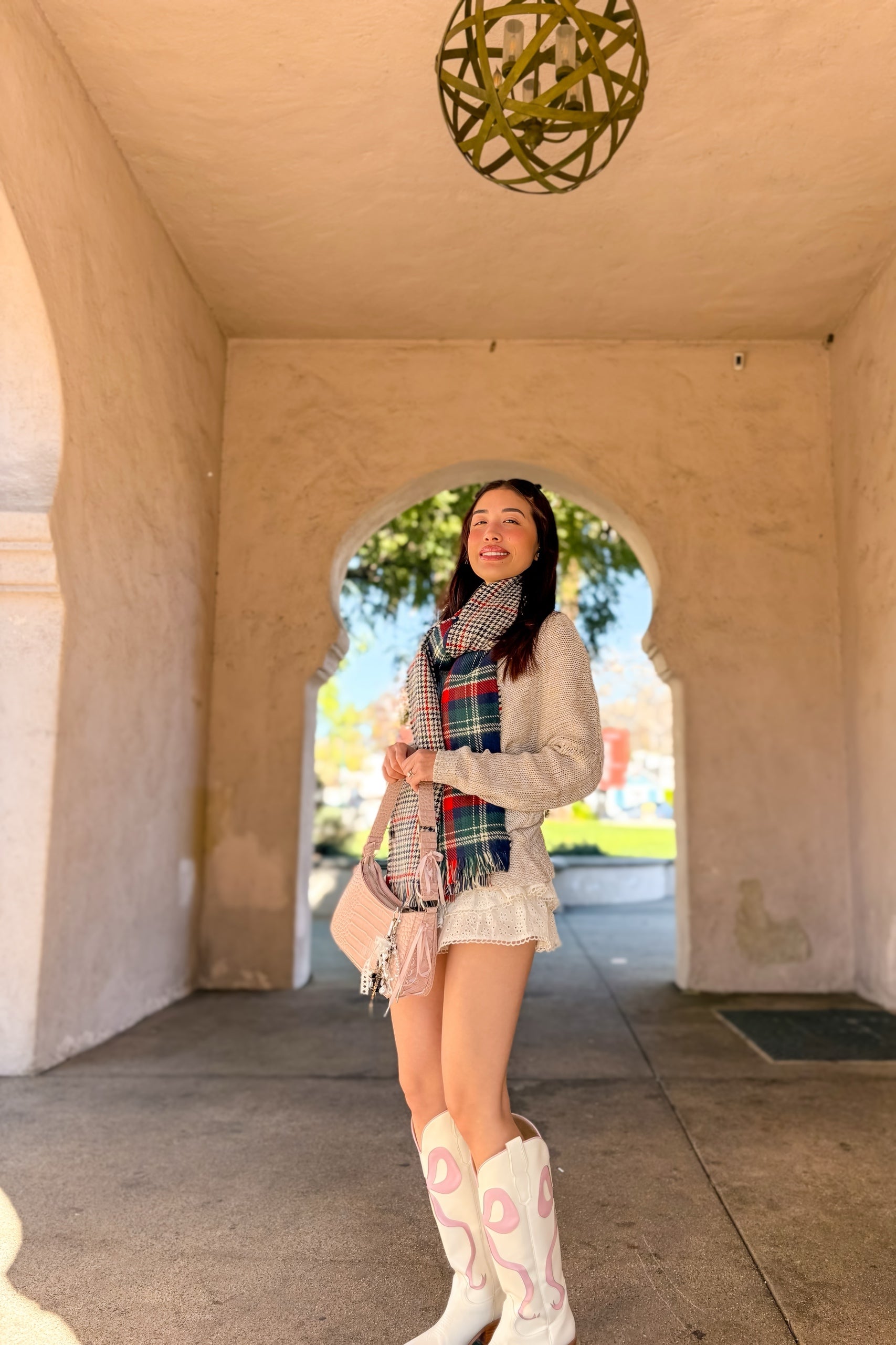 The Autumn Air Scarf is the perfect touch of timeless elegance for any occasion. Crafted from luxurious, reversible fabric – you can choose from classic green and red plaid on one side, and classic houndstooth on the other. Whether you're looking for a subtle addition to your wardrobe or a bold statement piece, this timeless oblong scarf will bring the perfect sophistication.