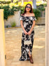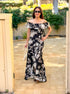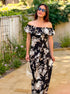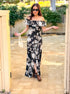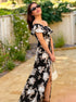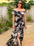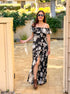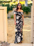 This gorgeous maxi dress features an off the shoulder ruffle layered design with zipper back that flows into a fitted bodice and a maxi skirt with side slit. Florals in shades of blue and black bloom throughout.
