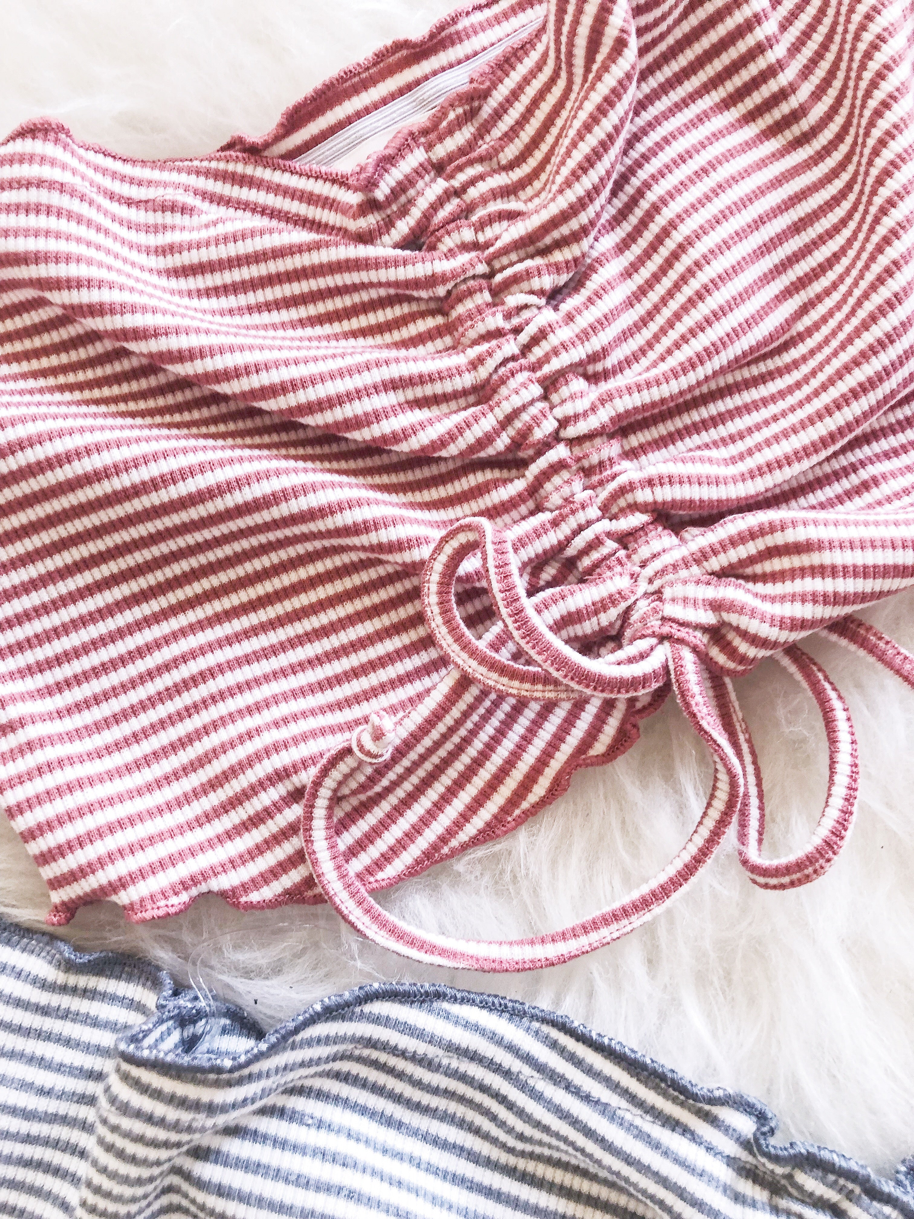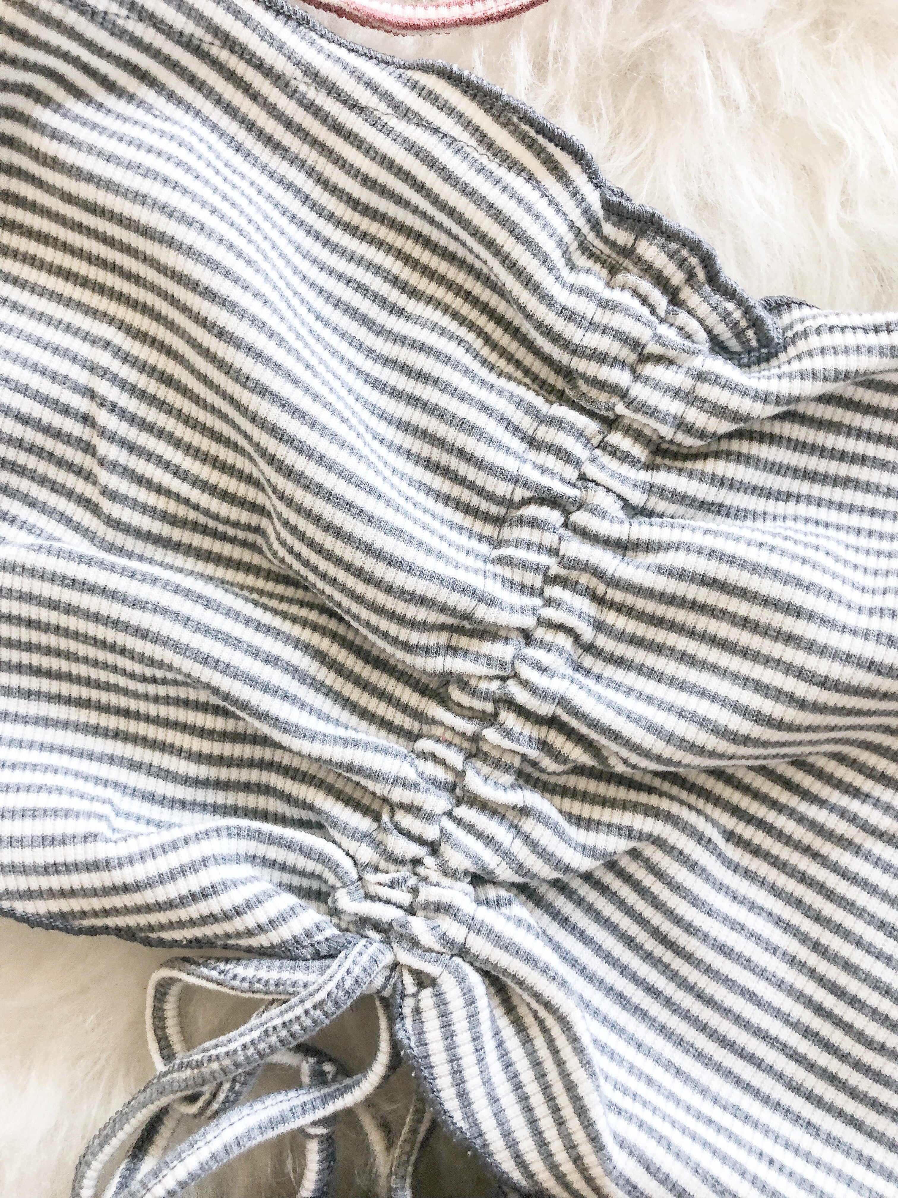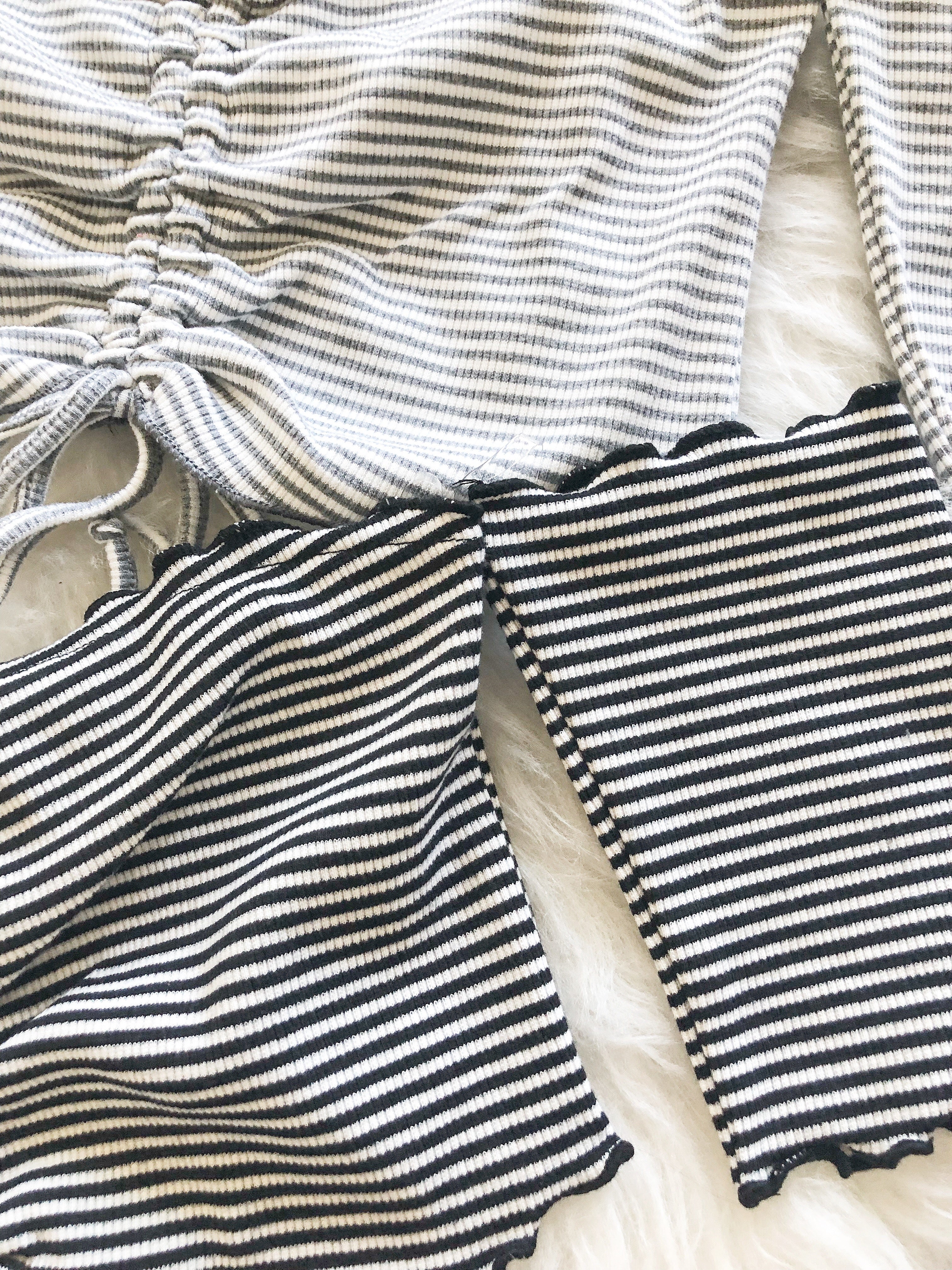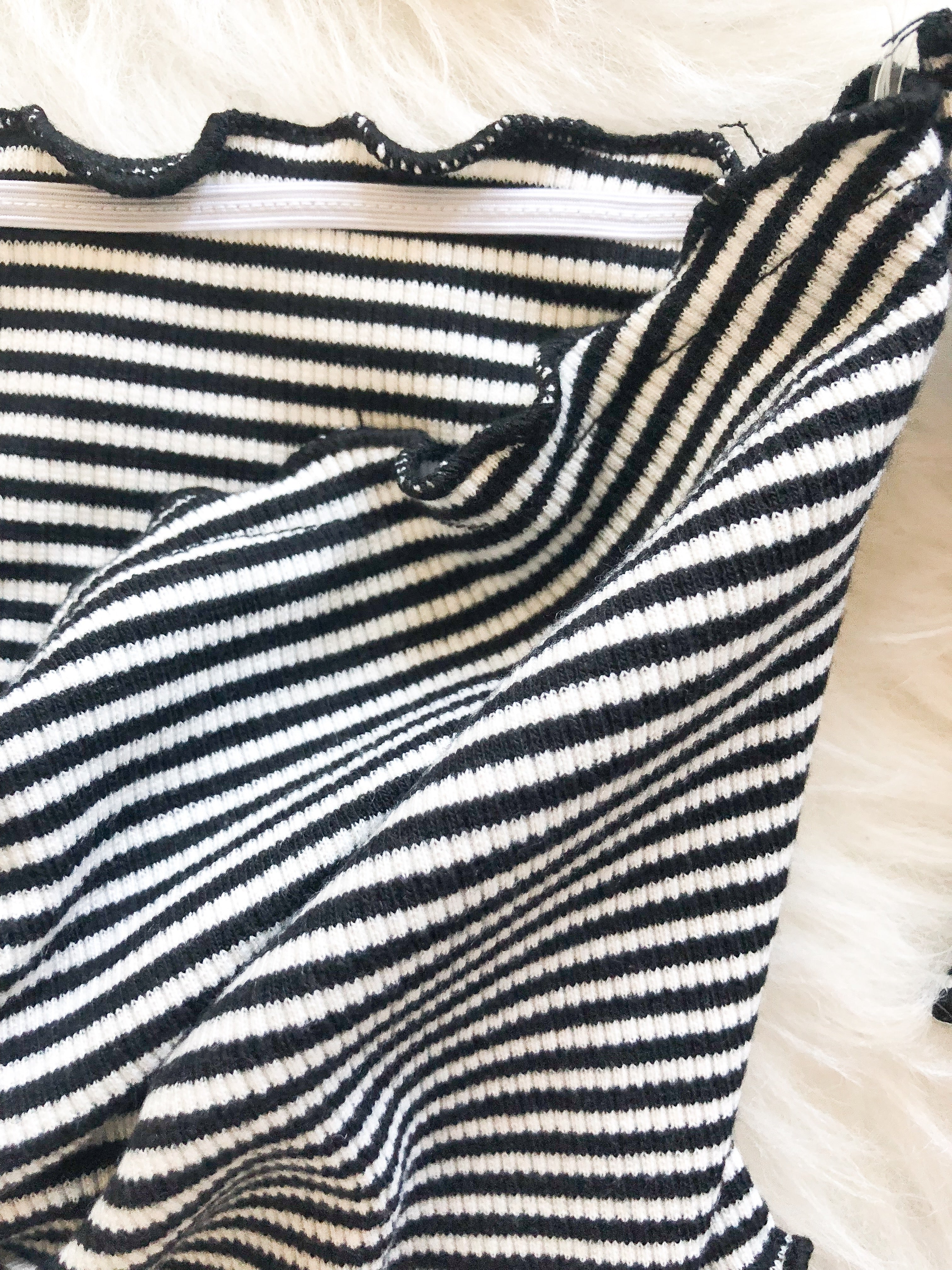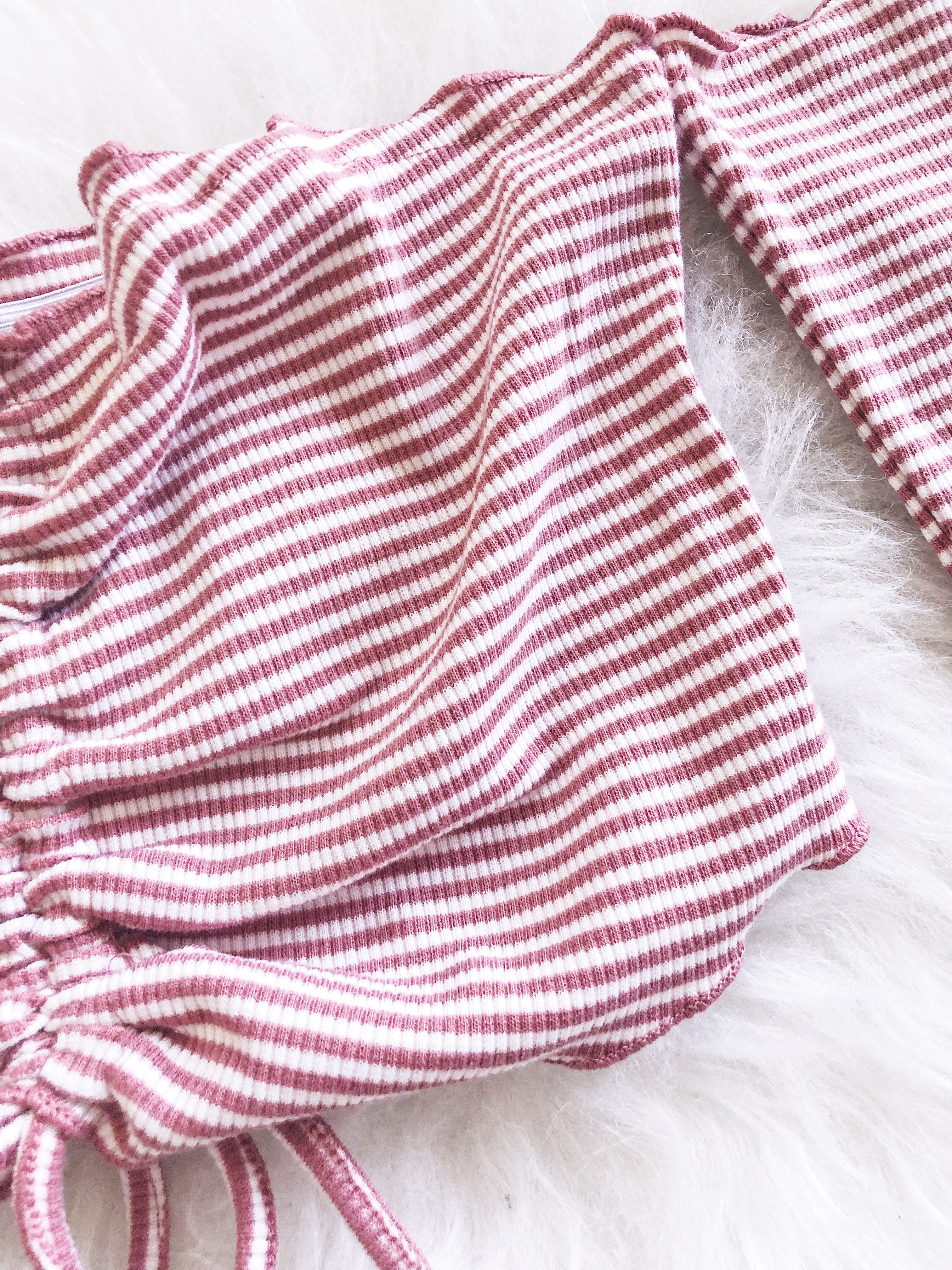 The Petal Ruche Top is the perfect blend of chic and comfort! With its off-the-shoulder design, front shirring, lettuce ruffle hem, and subtle stripes, you can have all the style you want without sacrificing your movement. Stretchy polyester-spandex fabric will hug your curves, just the way you want it. Get the trendiest look with this #stylish and oh-so-aesthetic top!
