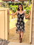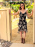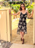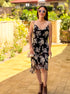 This cowl neck chiffon floral slip dress features an allover pattern of flowers in hues of blue, black, white, and grey.