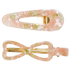 The Serendipity Hair Clip Set in Peachy Pink will add an exclusive and elegant touch to your ensemble. These luxury hair clips feature two alligator clips, a triangle clip, and a bow clip, in a beautiful combination of peachy pink hues and gold-tone metal. Add a touch of upscale sophistication to any look with this truly special set.